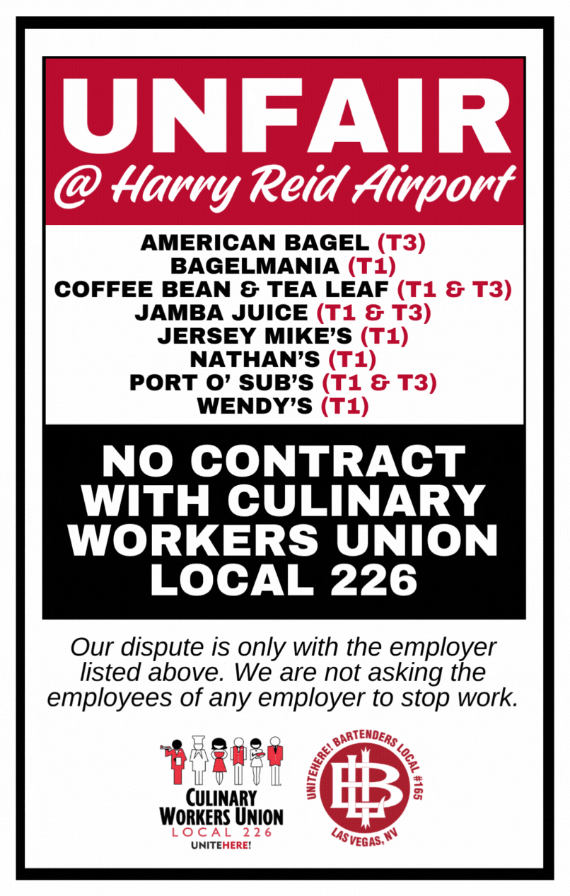 *Culinary Union members employed as cooks, fast food workers, bartenders, servers, and porters at Harry Reid International Airport DBE’s such as: American Bagel (T3), Bagelmania (T1), Coffee Bean & Tea Leaf (T1 & T3), Jamba Juice (T1 & T3), Jersey Mike’s (T1), Nathan’s (T1), Port O’Subs (T1 & T3), and Wendy’s (T1).